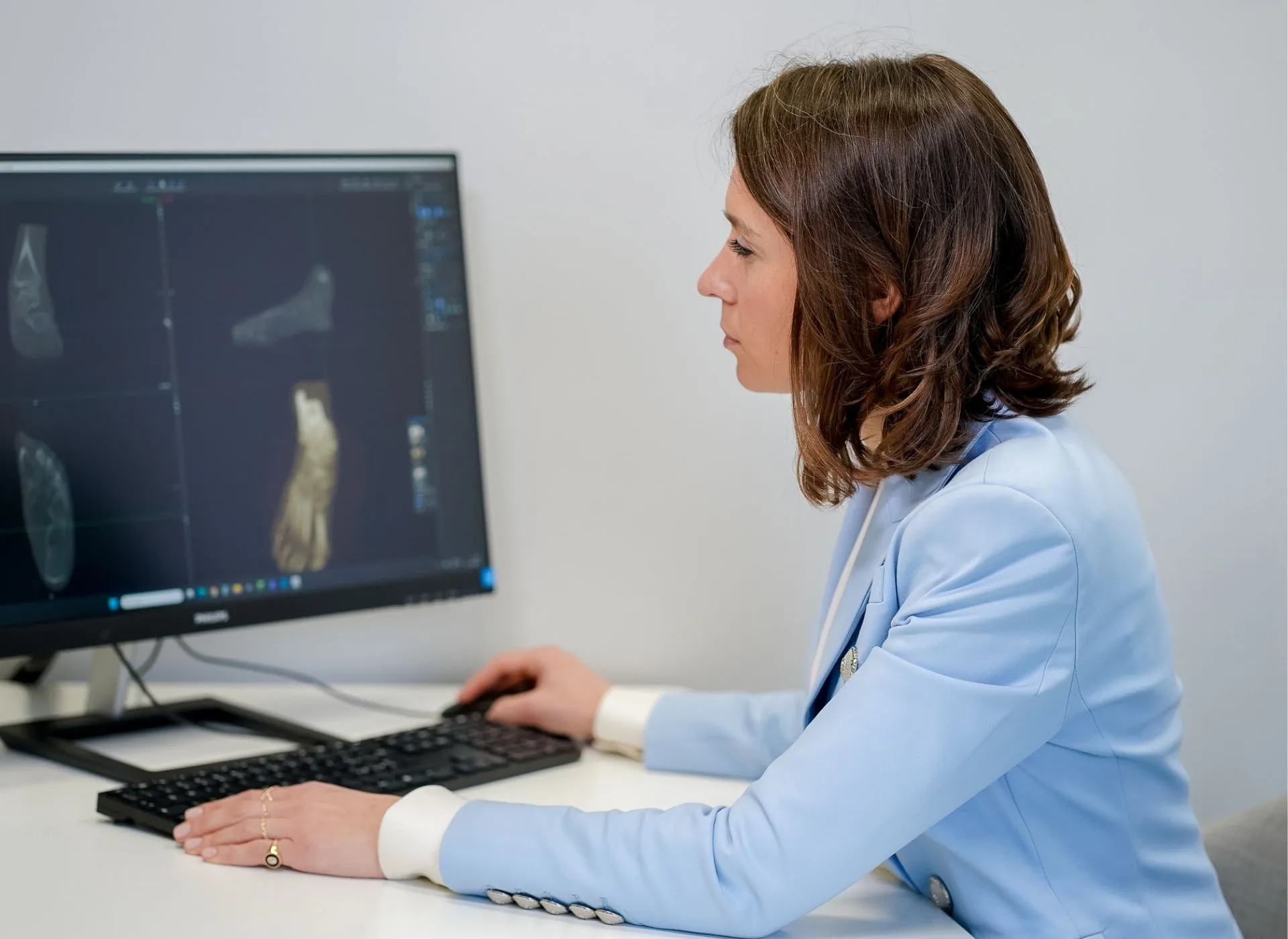 La TAC 3D Cone Beam con sistema Verity Planmed è una tecnologia avanzata disponibile in pochissimi centri in Italia dedicati a piede e caviglia. Si esegue in posizione eretta, quindi in carico, condizione fondamentale per studiare correttamente la biomeccanica del piede. A differenza delle indagini tradizionali, fornisce immagini tridimensionali estremamente precise, integrate anche con sistemi di intelligenza artificiale. Questo consente di ottenere informazioni più complete rispetto a una semplice radiografia e di pianificare il trattamento con maggiore accuratezza. È particolarmente utile nei casi di deformità complesse della caviglia o delle dita, permettendo di valutare con precisione sia la situazione iniziale sia il risultato post-operatorio.